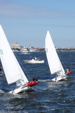 Kids from several different high schools in the Charleston area compete in the Leukemia Cup Regatta in 420s.  This is the same class of boat used collegiately.  You may have to squint, but can you see the Battery in the background?